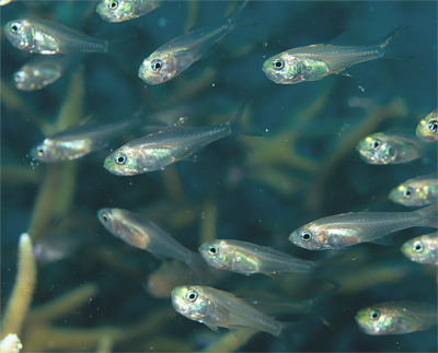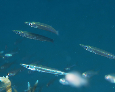 この根にはカマスの幼魚(全長10pくらい)小群も