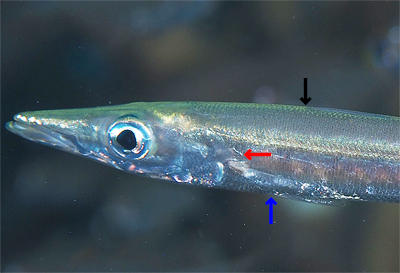 第1背鰭先端↓は腹鰭先端↑より後ろ