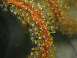 ところで,ニュースに載せたホソガラスハゼやガラスハゼの1種が付いているヤギとはたぶん別種の,ポリプ外側が黄色いきれいなヤギがありました。