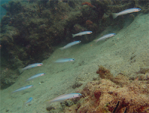 この冬は黄色い子供のままか,あるいは冬のうちに変化があるのか?・・・今日のように北風が強くても潜れるので,冬の楽しみな継続観察の1つです♪ 浅場に上がって窒素抜きがてらウロウロしていると,近づき易いイトマンクロユリハゼの1群がいました。
