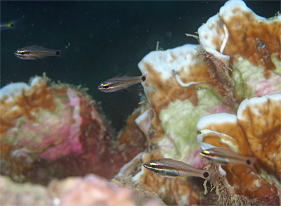 奥のソメワケイソハゼはこれで成魚クラスの大きさ