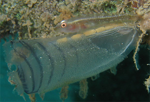 ウミショウブハゼ属の1種3 Pleurosicya sp.3 (たぶん「日本のハゼ」(初版1刷)のウミショウブハゼ属の1種-2) 撮影データ:全画像 倉崎ビーチあるいはやや湾奥,水深約5〜18m, カイメンソウ,ムネボヤ,カイメンの1種またはヒロハサボテングサに着生 |